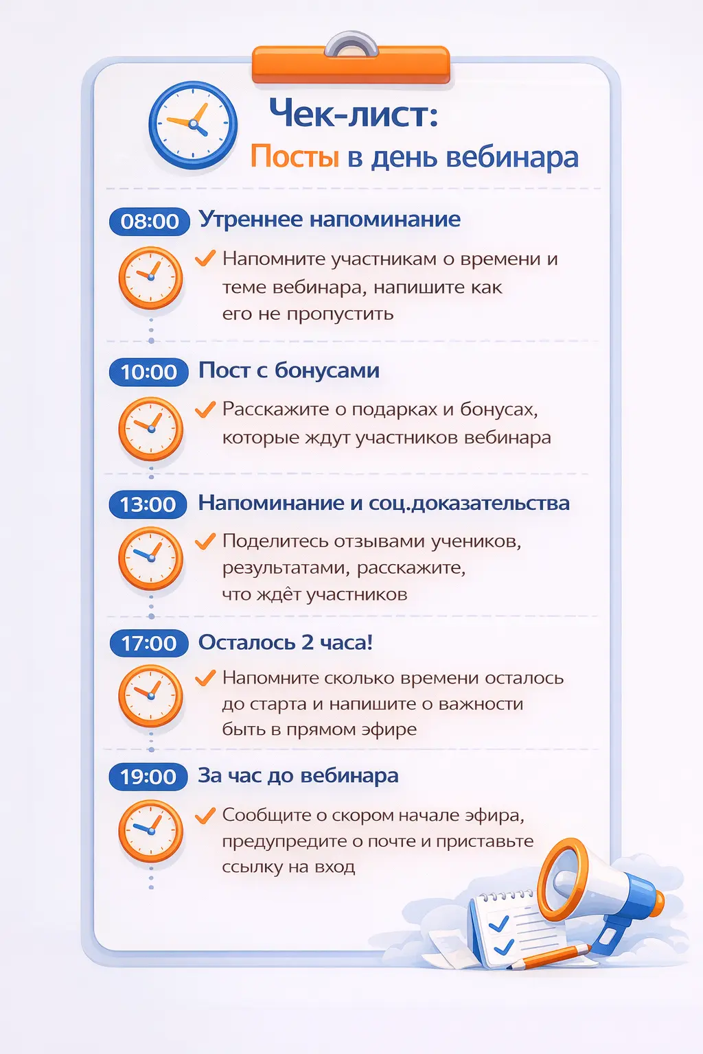 В день вебинара весь контент направлен на рассказ о том, что участники получат на мероприятии, с многократными напоминаниями по расписанию.