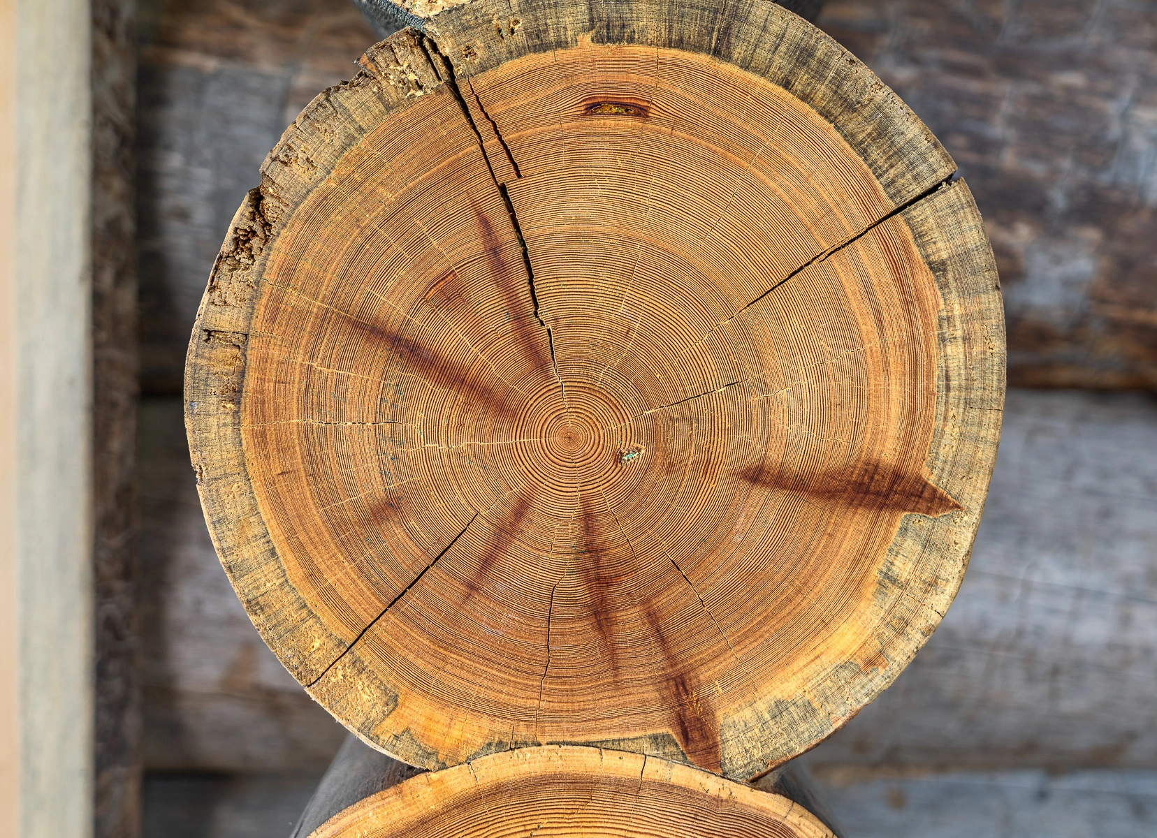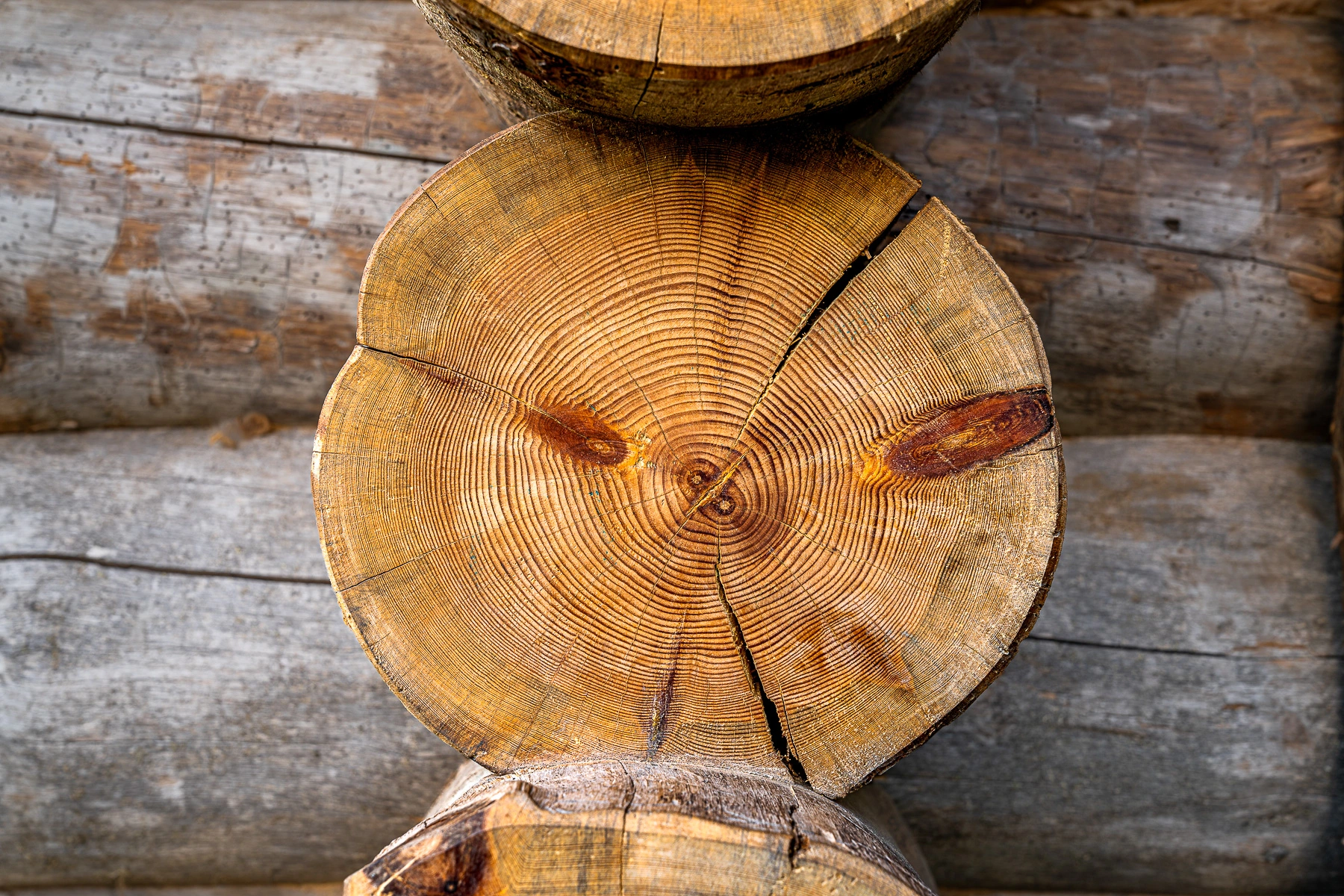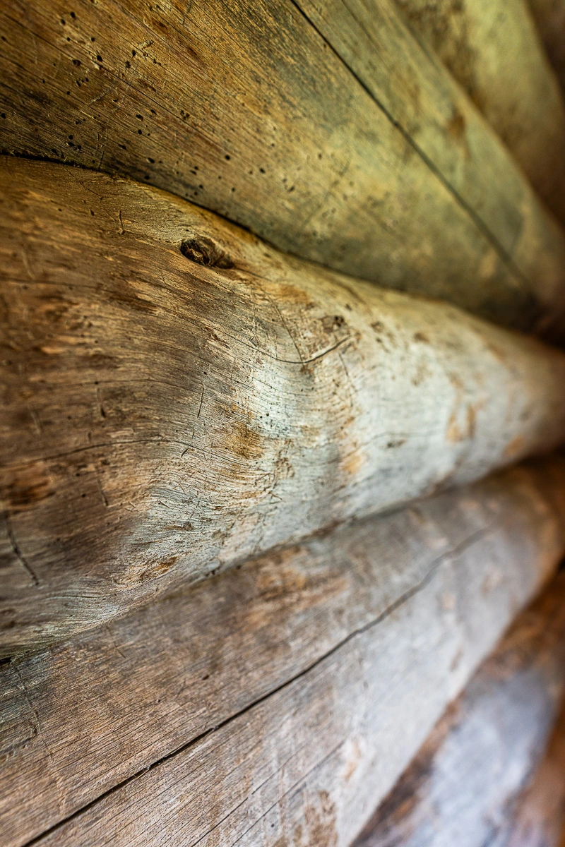 Кело нередко называют сухостойной сосной – и на то есть веские причины. В отличие от обычного леса, который рубят “свежим”, сосна Кело высыхает прямо в лесу, стоя вертикально много лет. За десятилетия природной сушки структура древесины уплотняется. Происходит естественная консервация: древесина теряет излишнюю влагу без каких-либо камерных сушек. Впоследствии брёвна не будут произвольно деформироваться или трескаться – основные усадочные процессы древесина прошла ещё в лесу. Более того, длительное воздействие ветра, солнца и мороза придаёт Кело характерный внешний вид: поверхность ствола покрывается серебристо-серой патиной, а естественные трещины образуют благородный рисунок. Такой рельеф невозможно подделать или искусственно имитировать – это живая текстура настоящего северного дерева.