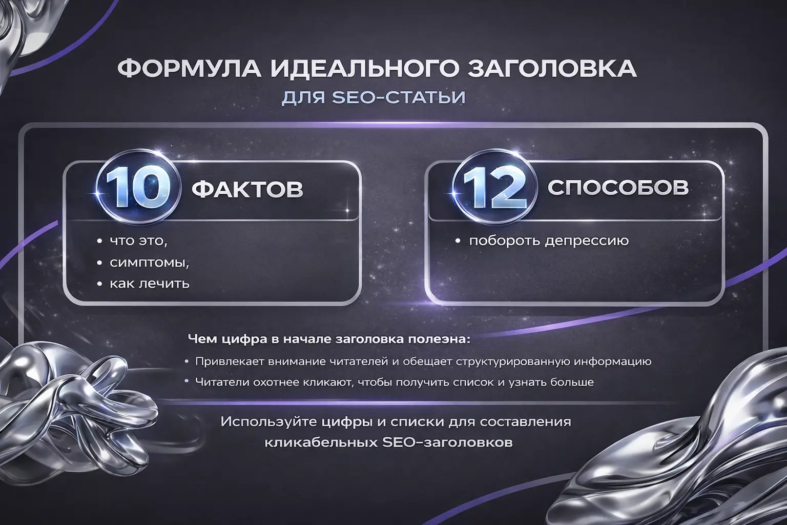 Добавление цифры в заголовок кардинально увеличивает кликабельность. Цифры воспринимаются мозгом мгновенно и обещают структурированную информацию, которую легче усваивать. Правильный формат: "10 фактов о депрессии: что это, симптомы, как лечить" или "8 типов женщин, которые привлекают мужчин".