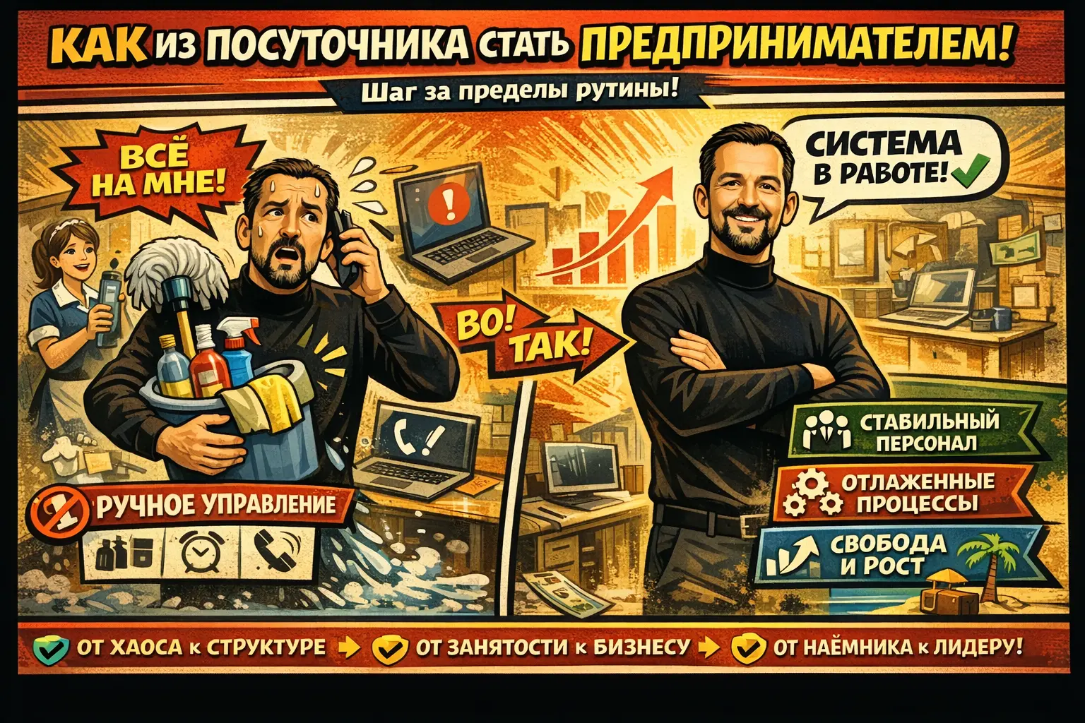 В какой то момент главный вопрос перестает звучать как «кто сегодня выйдет на уборку». Он звучит иначе. Может ли этот бизнес работать без моего постоянного участия. И если ответ отрицательный, проблема не в рынке. Проблема в том, что предпринимательская роль еще не занята.