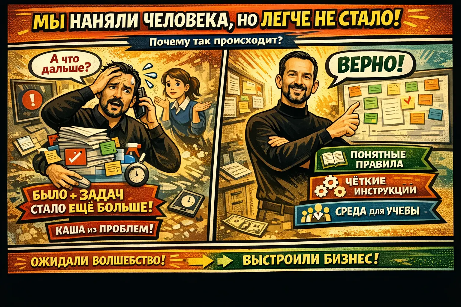 В момент найма есть сильное ожидание. Кажется, что сам факт появления сотрудника автоматически снимет нагрузку. Что задачи «перейдут» и освободят время. Это логичное ожидание, но оно редко совпадает с реальностью.