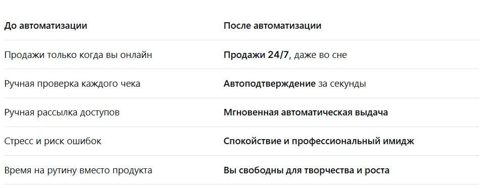 Но вместо радости от первых продаж вы погружаетесь в ад рутины: вручную проверяете чеки в банковских приложениях или чатах, вручную отправляете ссылки на доступ, отвечаете на одни и те же вопросы по ночам. Каждая продажа, вместо того чтобы приносить радость и деньги, отнимает время и силы, которые можно было бы вложить в развитие или новый контент.