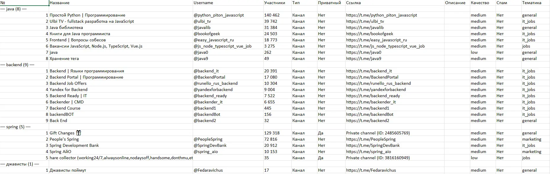 - Агрегаторы-боты: используйте инструменты вроде @FindTGChatsBot. За минуту выгружаете сотни нишевых каналов нужной тематики с фильтром по количеству подписчиков. Это экономит 3 часа рутины в день.