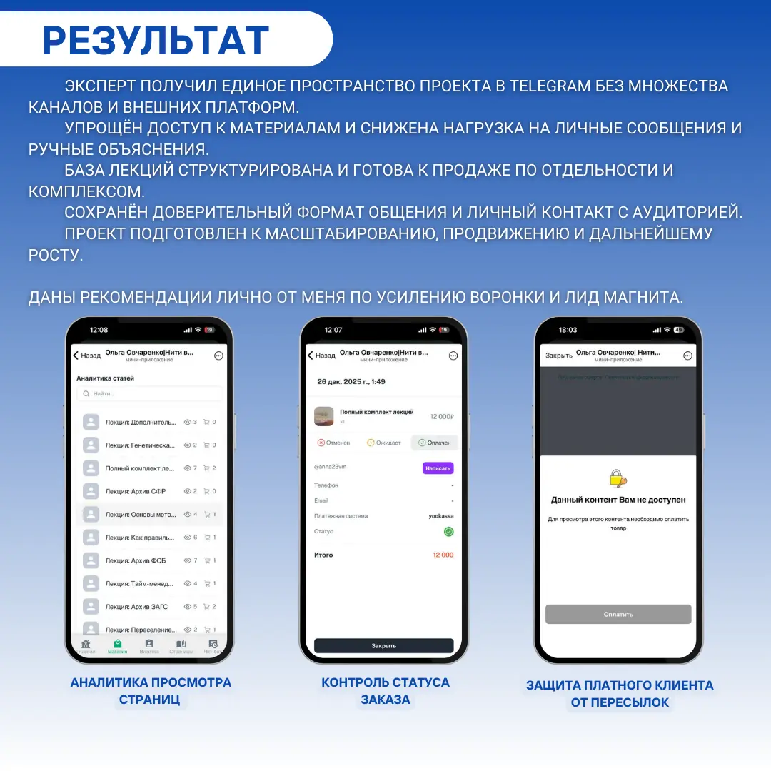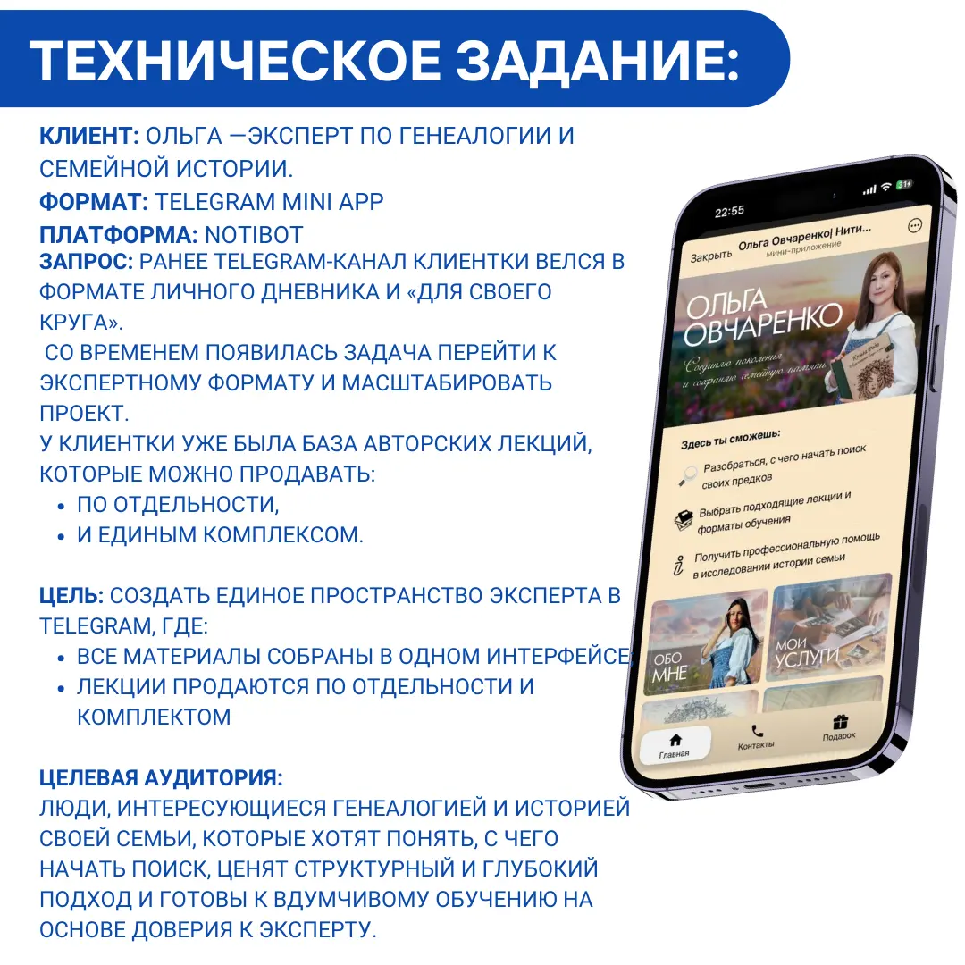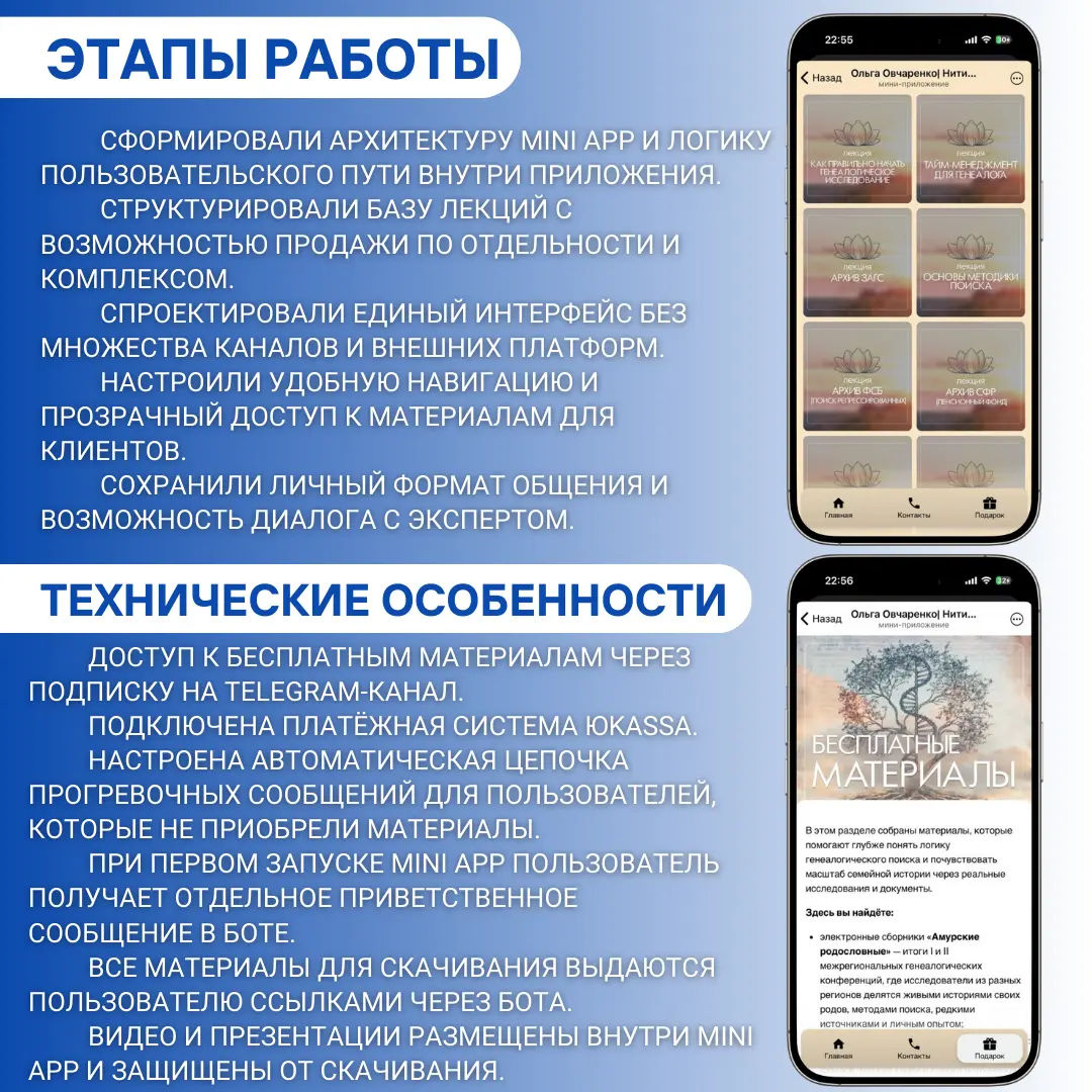 Далее я покажу это на практике — на собственном кейсе для сложной ниши.На примере проекта в области генеалогии разберём, как мы упаковали экспертную экспертизу и выстроили полноценный магазин обучающих лекций внутри Telegram Mini App — без внешних платформ, хаоса и потери внимания аудитории.