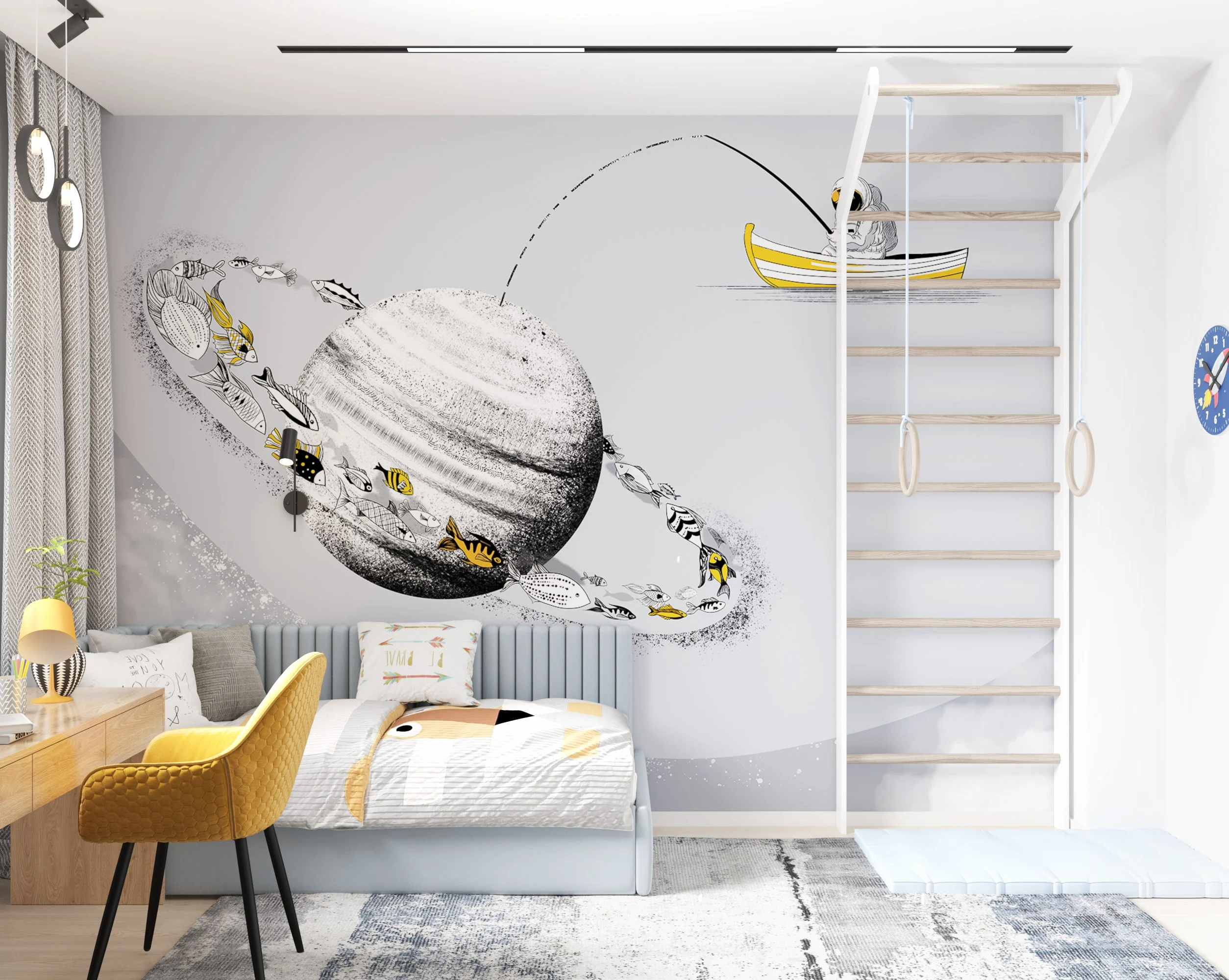 • Ребенок-школьник много времени будет проводить за письменным столом. Продумайте его местоположение с учетом хорошего дневного освещения и возможности разместить все учебные принадлежности. А для физической разгрузки можно установить в комнате шведскую стенку.